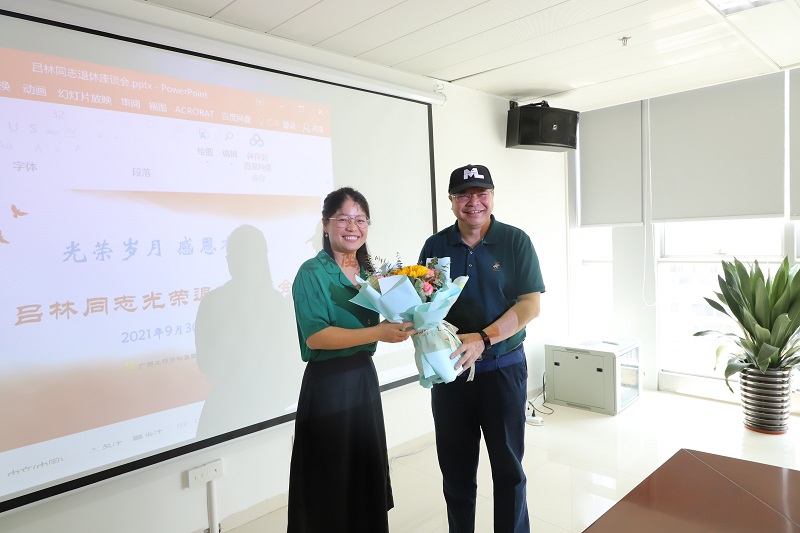 莫道桑榆晚,為霞尚滿天。9月30日上午,公司舉辦資深業務經理呂林同志的退休座談會。公司黨委書記、董事長、總經理龐漢,黨委副書記、工會主席左俊蘭,副總經理盧德冠,副總經理黃燦輝,總工程師王豐贊及相關部門負責人齊聚一堂,歡敘暢談,以最真摯的情誼祝賀呂林同志光榮退休。