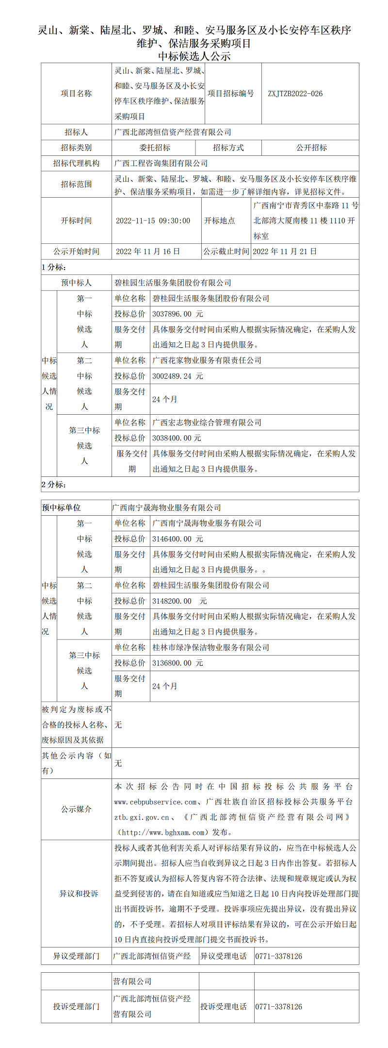 靈山、新棠、陸屋北、羅城、和睦、安馬服務區及小長安停車區秩序維護、保潔服務采購項目中標候選人公示