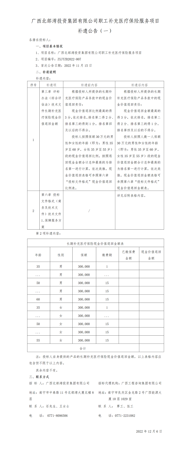 廣西北部灣投資集團有限公司職工補充醫療保險服務項目補遺公告(一)