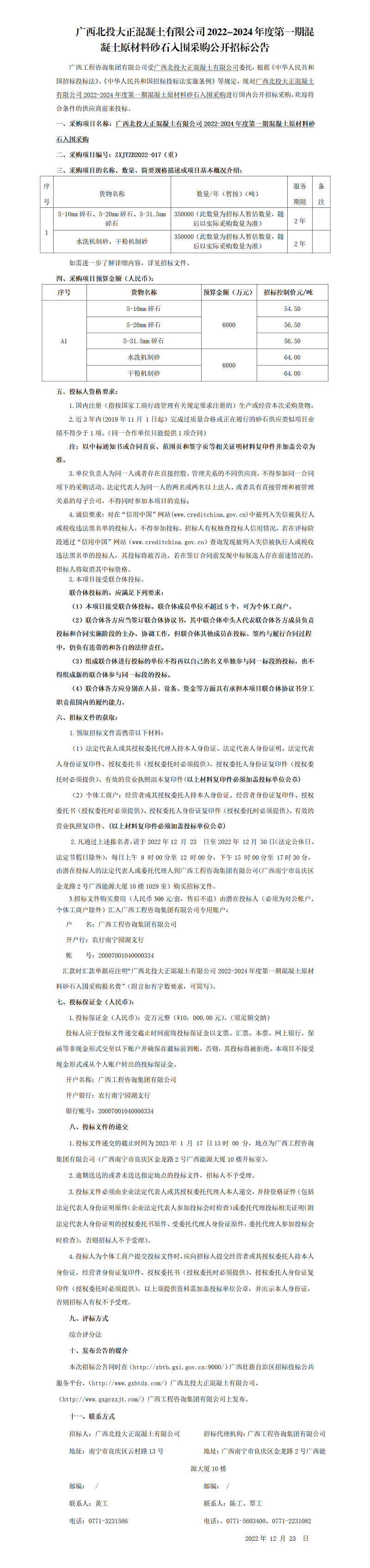 廣西北投大正混凝土有限公司2022-2024年度第一期混凝土原材料砂石入圍采購公開招標公告