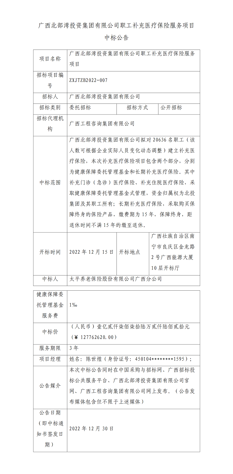 廣西北部灣投資集團有限公司職工補充醫療保險服務項目中標公告