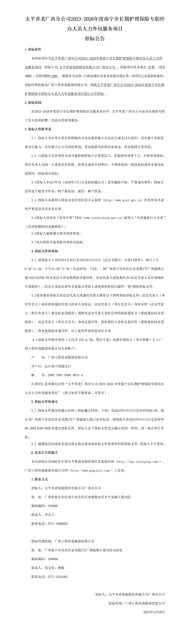 太平養(yǎng)老廣西分公司2023-2026年度南寧市長期護理保險專職經(jīng)辦人員人力外包服務項目招標公告