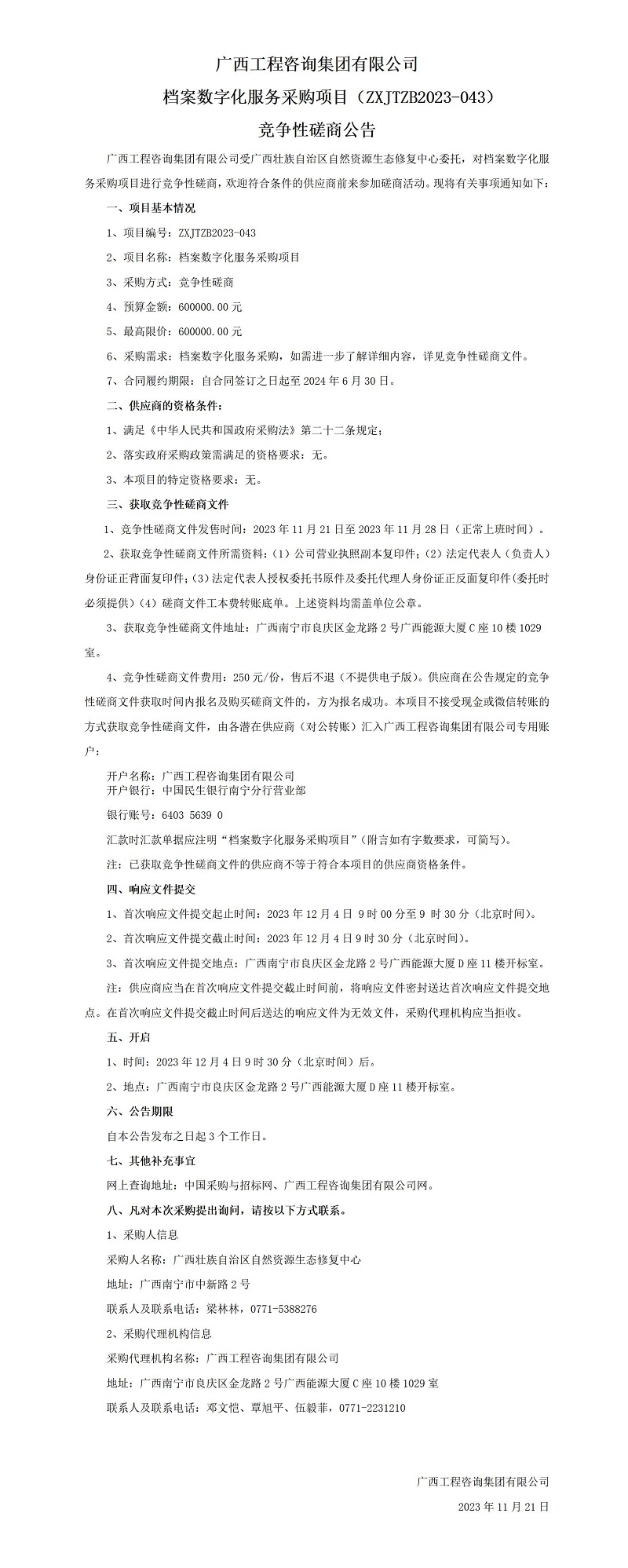 廣西工程咨詢集團有限公司檔案數字化服務采購項目(ZXJTZB2023-043)競爭性磋商公告