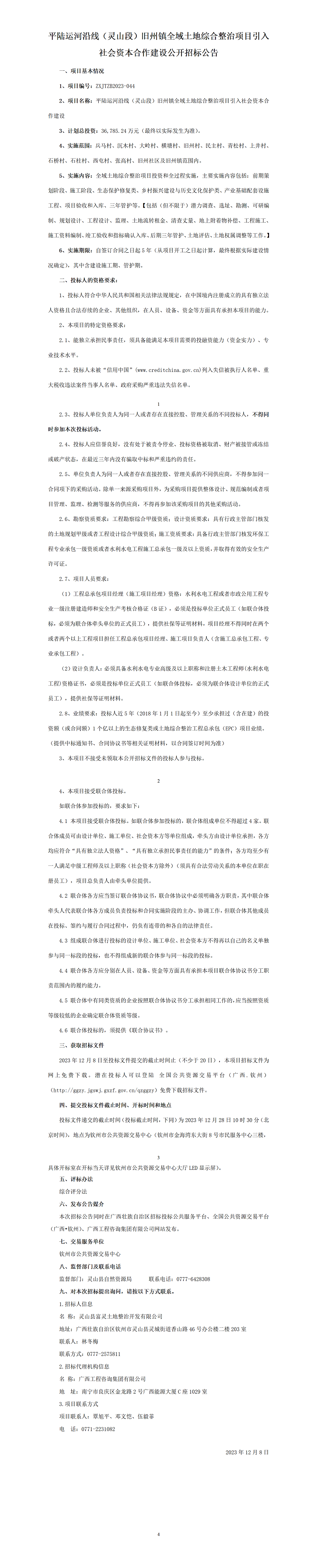 平陸運河沿線(靈山段)舊州鎮全域土地綜合整治項目引入社會資本合作建設公開招標公告