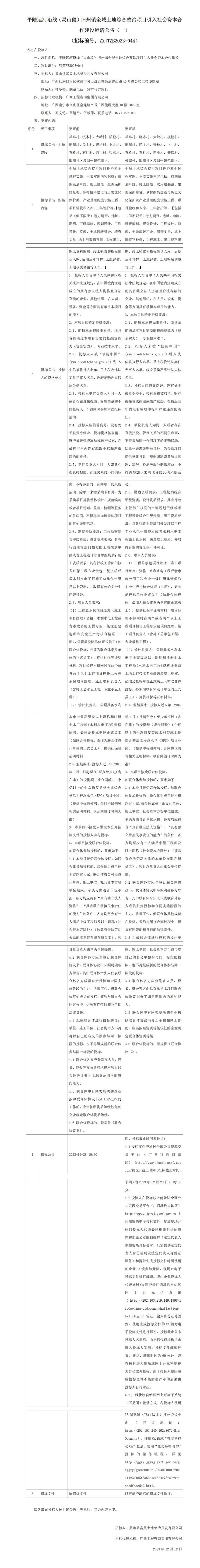 平陸運河沿線(靈山段)舊州鎮全域土地綜合整治項目引入社會資本合作建設澄清公告(一) (招標編號:ZXJTZB2023-044)
