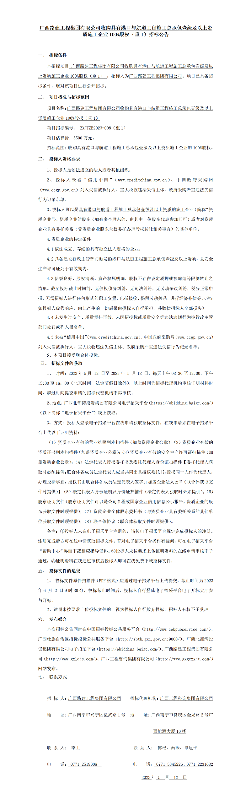 廣西路建工程集團有限公司收購具有港口與航道工程施工總承包壹級及以上資質施工企業100%股權(重1)招標公告