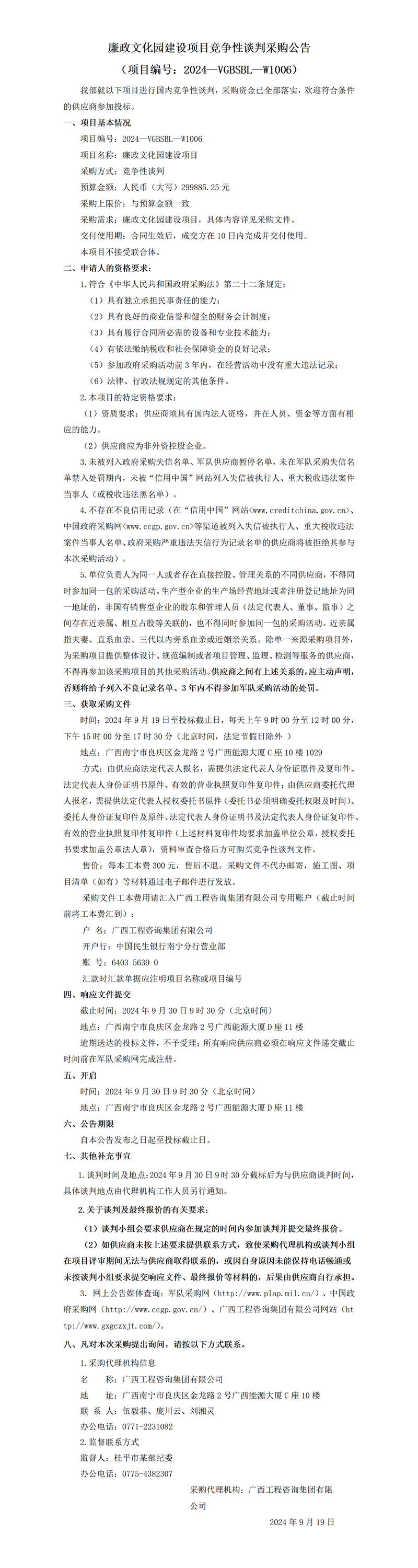 廉政文化園建設項目競爭性談判采購公告 (項目編號:2024—VGBSBL—W1006)